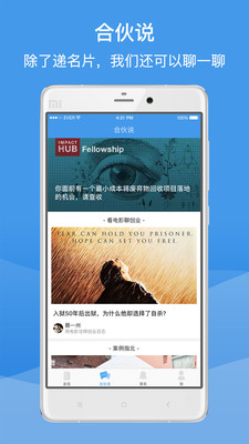 3.合伙说:APP上的“合伙说”头条每天会发出几个创业路上的真实问题,合伙人脉通过选择”赞成“或者”反对“并分享自己的观点。基于大家在行业合伙问题上的看法,系统会把看准关键问题的合伙人有效得匹配起来。