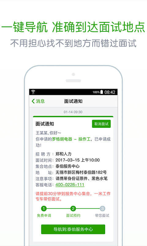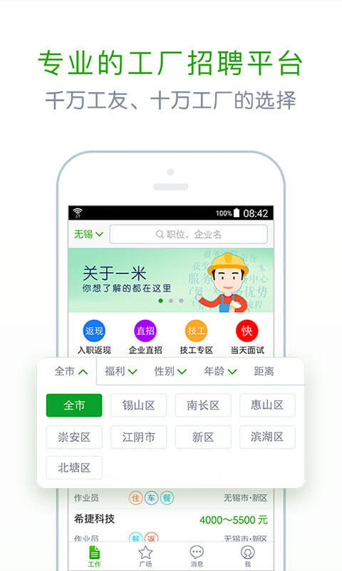 一米工作首创从线上求职平台到线下服务中心一站式服务流程,目前一米工作服务中心已覆盖苏州、昆山、常熟、吴江、太仓、无锡、南京、常州、南通、合肥、杭州、上海、成都等城市主要工业园区和务工人群聚居地。我们为打工人群提供现场接待、专车接送、面试带队、入厂跟踪等全流程服务。一米工作特色的当天面试、附近企业、企业直招等版块,让您更快更方便地找到合适的工作!