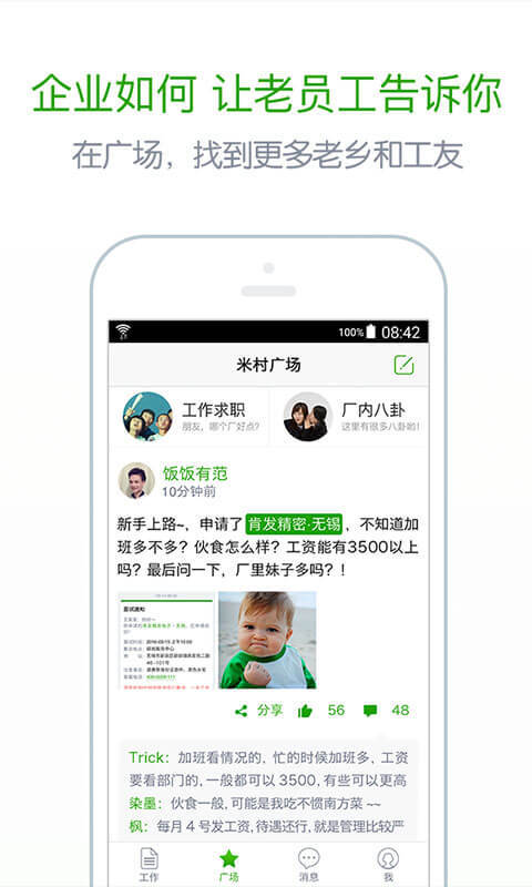 找老乡、找同事,找附近的工友,听大家点评企业怎么样,一起分享打工生活的点点滴滴......
