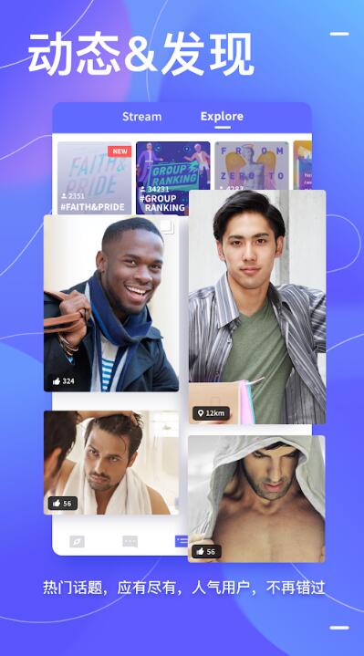 Blued国际版2019作为全球最大的同志社交平台,其用户多达3000万,相互建立联系并倾诉自己的故事。当然,你也可以通过平台向好友发送即时信息、互传头像或加入自己感兴趣的群组以方便将来有时间一起聚一聚。