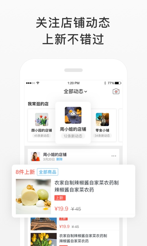 *发现:发现各种回头客推荐的口碑小店,逛到停不下来; *关注:找到中意的小店就收藏了吧,以后他的新品、店家动态都可以随时轻松查看了; *消息:在这里可以和熟悉的店家聊天,管理你的联系人,和更多的人成为朋友; *购物车:送你一辆装满幸福好物的购物车; *我的:为你提供商品、订单、购物车,收藏的店铺等统一管理功能,你收藏的店铺还可以按自己喜欢的分类来整理;