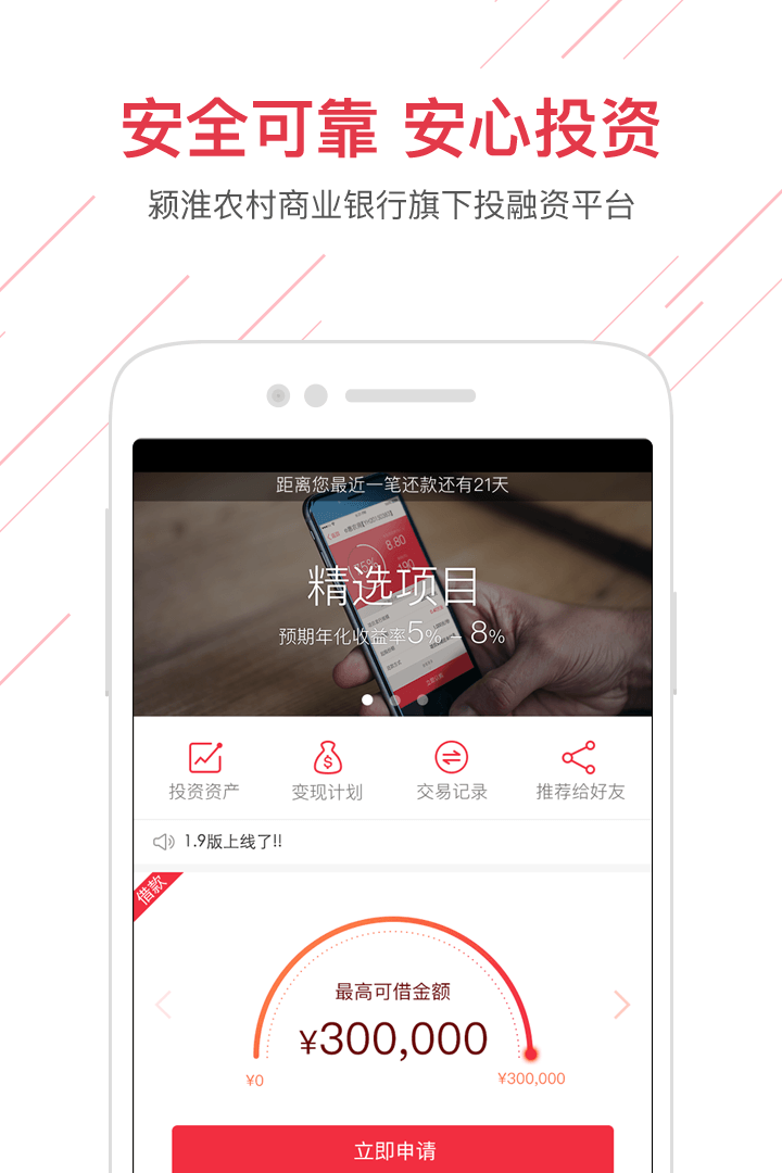 e惠农商是颍淮农村商业银行倾力打造的专业、稳健、高效、透明的互联网服务。旨在为融资者解决燃眉之急,快速融资;帮投资者筛选出低风险、高收益的金融投资项目,让您稳赚收益,让赚钱变得更简单!
