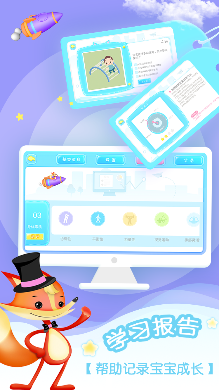 【皮皮狐】是针对学前儿童在幼升小阶段的衔接问题而开发的产品,专注为3-6岁儿童设计,覆盖了宝宝社会性发展,心智发展,身体素质发展3大模块60多项入学前必备发展指标,宝宝可以在场景故事中深度体验故事人物的所知感,通过帮助场景人物解决问题而掌握社会生存技能,家长能够随时掌握宝宝的发展现状,取长补短,帮助每一位宝宝顺利过渡到小学。