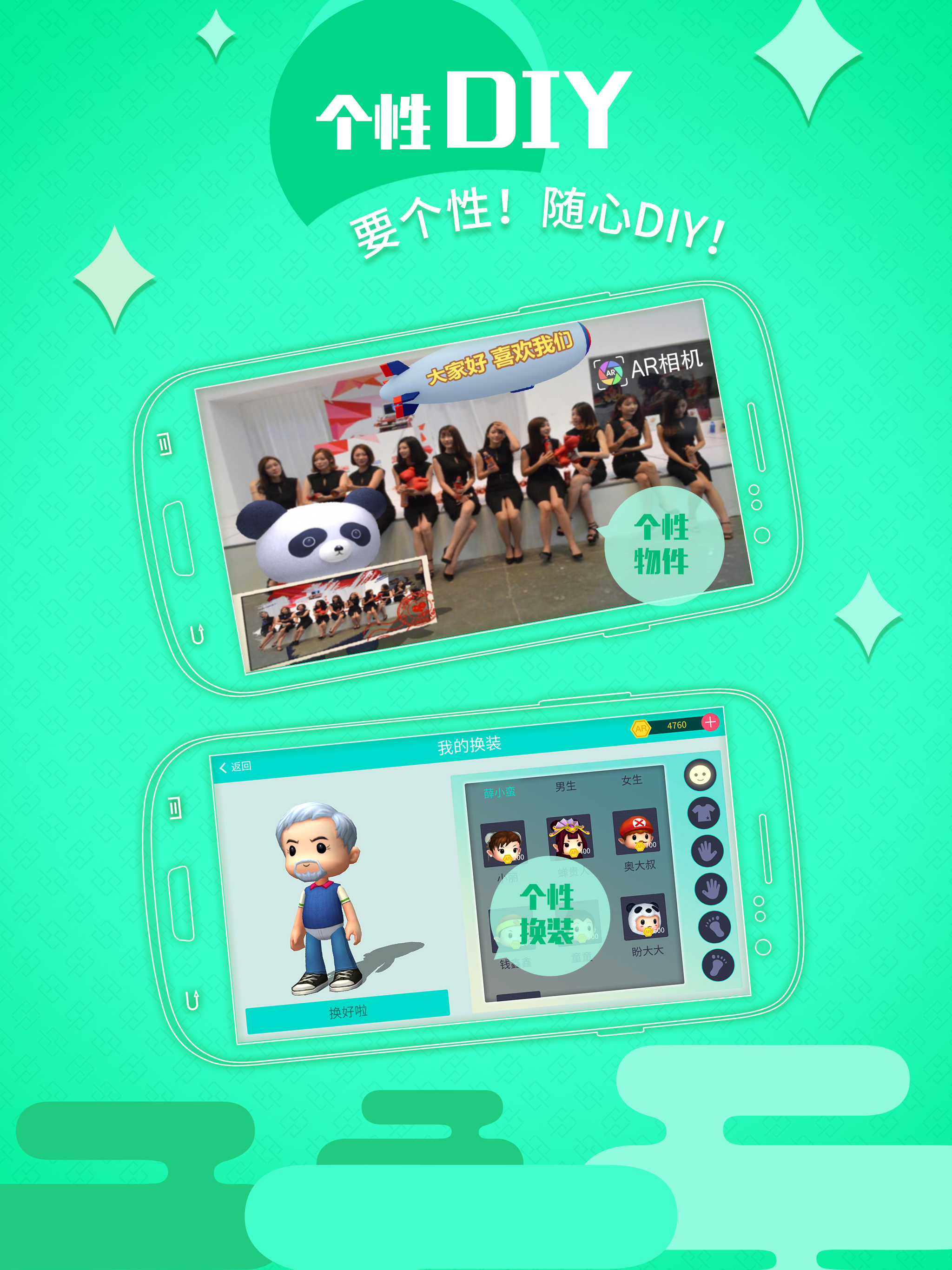 在《AR相机》中定制自己的虚拟形象,换装,摆POSE,一起合影。