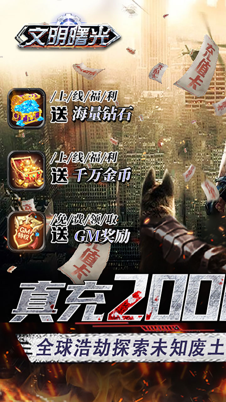 《文明曙光-送GM两万充》一款末世冒险游戏,强者生存!次世代废土MMORPG手游强势来袭!上线赠送万充大礼包,1钻石购买万元真充卡!活跃无限抽充值!BOSS无限爆充值!世界为何会变成这样?人类为何迎来末日?恶意引爆的核弹,不计后果的战争,摧毁了文明与秩序,残存的人类躲入地下避难所,苟延残喘。百年之后,世界已是面目全非,暴虐的永夜军变异人横行霸道,幸存的人类组成方舟联合竭力对抗。神秘的勇士离开地下避难所,为寻找拯救末世的希望,踏上探索新世界的征程