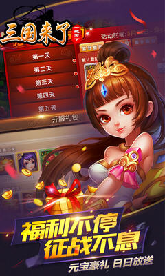《三国来了满V》是史上最具良心的卡牌手游,不仅拥有“武将七星平滑培养设置”、“武将资质上限明确设置”、“神将人人可得设置”等三大良心游戏设定。 同时每天的各类活动,花样繁多,奖励丰富,让玩家在正统三国的游戏世界爽翻天! 三起云涌,英雄集结辈出。