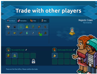 -创建精美的房间并探索由其他人创造的空间- 与其他人交易稀有物品并使用交易许可来运行你自己的商店- 加入、活动以及任务等- 最大的无尽缩放复古像素世界- 24/7全天候管理团队