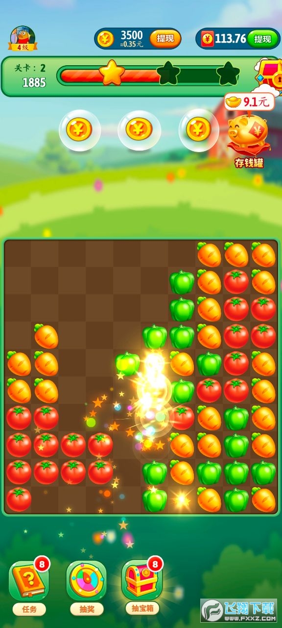 1、农场里有很多水果和蔬菜。玩家可以通过消除相同的三种水果或蔬菜来获得积分。