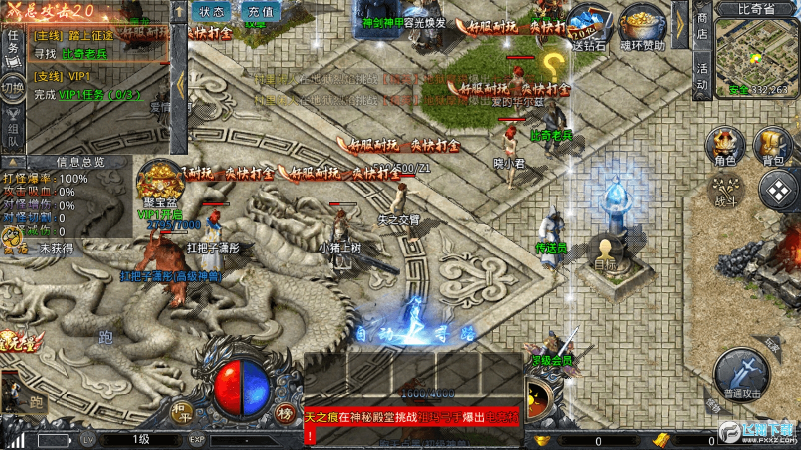 凤凰传奇手游是一款超级好玩的传奇游戏,这款游戏有着非常炫酷的战斗画面,玩家需要不断的提升自己的咱都能力,各种角色装备随意的挑选,千人同屏,经典争霸赛再启。随机触发每个地图,地图大,怪物多,爆率高,难度高!收入高!风险很大!喜欢就来下载这款游戏吧!