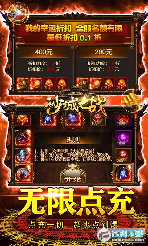 《沙城之战折扣充值抽大奖》永久折扣商城,内置大量超值折扣大礼包,名额有限,每天可购买!等你来抢!!装备全靠爆,为散人玩家提供超爽的游戏体验。新添加惊喜,全民在线瓜分千亿红包,更有概率获得真充卡,白嫖体验更上一层楼!内置生肖装备,打BOSS、转生等级皆可获得,激活十二生肖,即可激活超强属性,战力飙升,开启霸服新篇章。创角再领六大超级福利,大陆纷争攻城掠地,强者为王!更有疯狂大转盘,内有超强战灵神兽装备及大量极品道具,抽到哪个都不亏!充值送大量转盘抽奖卷轴!