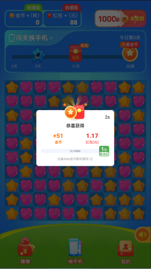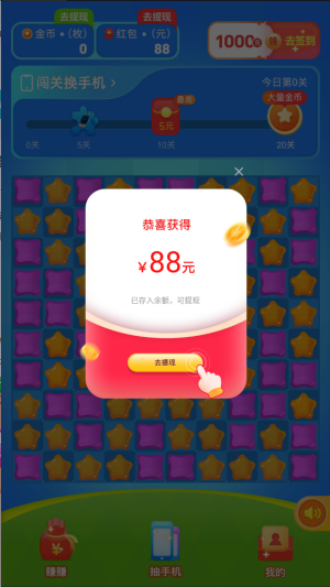 喜庆刷刷,汇量聚能新推出的一款红包版消消乐游戏。采用了轻松简单的闯关玩法,过关就能领到奖励,积累红包和金币奖励就能够兑换提现了!轻松点击就能大片方块,简单好玩有,关卡多多,奖励多多!