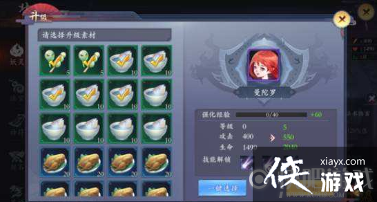 这里需要注意的是,每一种经验道具的右下角,都有一个数字,这个数字代表着该道具能够提升的经验值。有时,我们将妖灵提升至满级,经验会溢出,这个时候我们就可以更换经验值更低的道具使用,以免浪费。