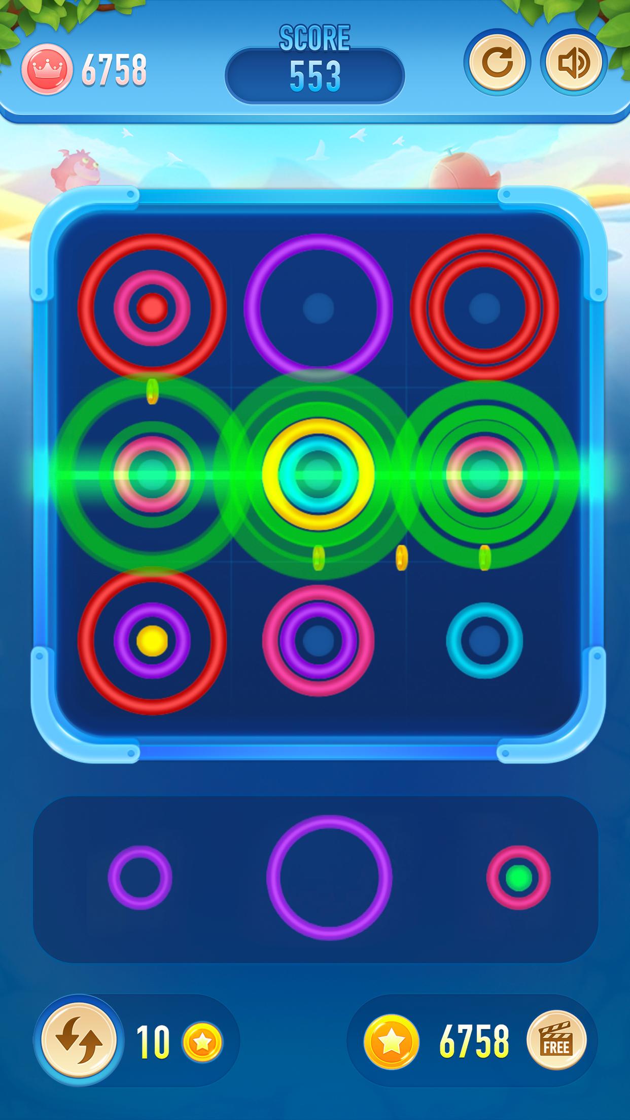 疯狂色环是一款简单而多彩的益智游戏。将正确的色环匹配到行上。简单易玩,令人愉悦的游戏。完成令人费解的戒指挑战,并获得尽可能高的分数。你能清除棋盘吗?你能在排行榜上达到前1名的高分吗?你能得到令人难以置信的组合吗?如何玩 *只需拖动彩色圆环并将其放入网格中。* 通过使水平线、垂直线或对角线具有相同的颜色来删除环。
