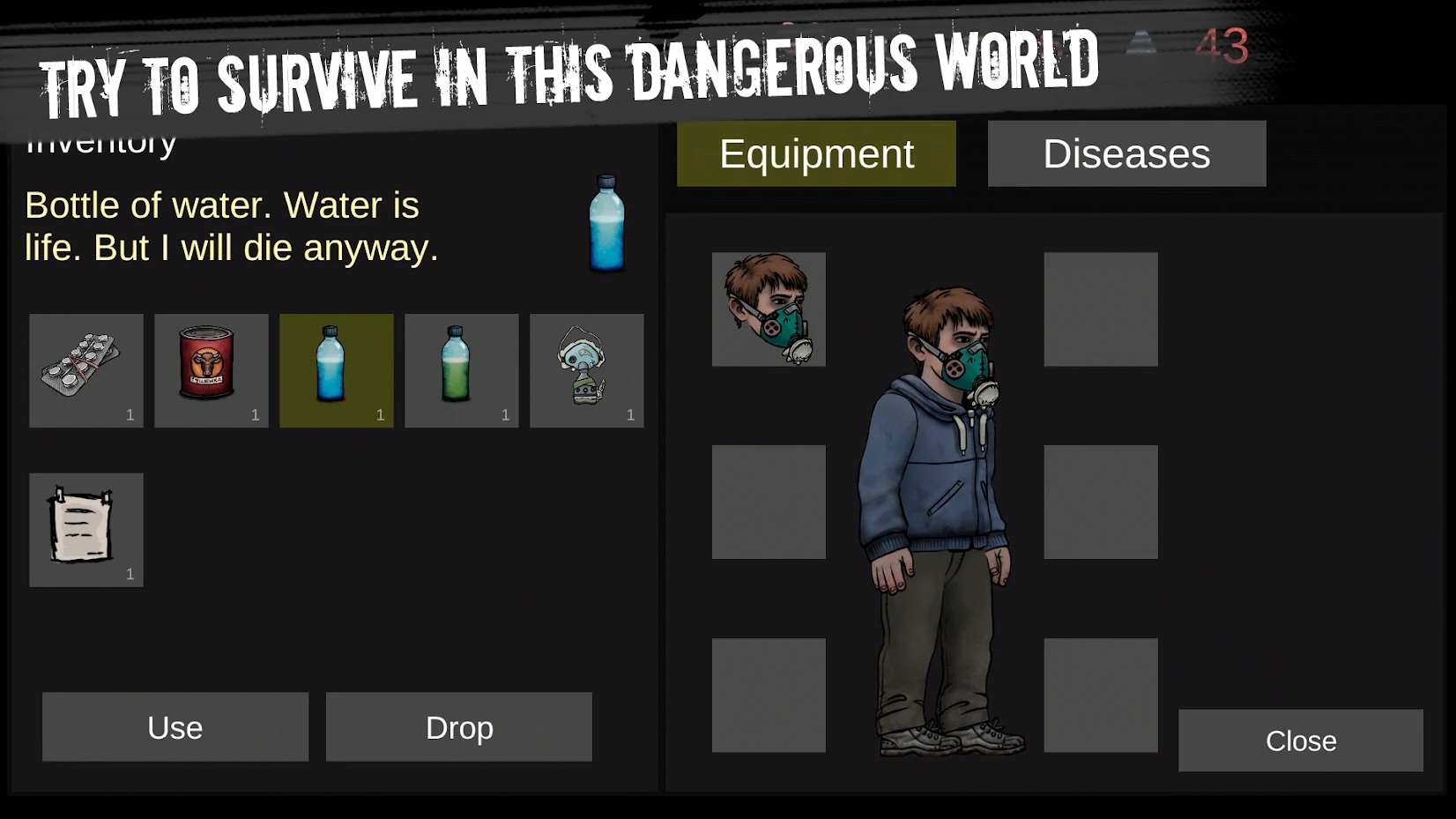 - 艰难的生存。你会被幸存者的典型问题所困扰,例如饥饿、疾病、口渴、核冬天和帮派。