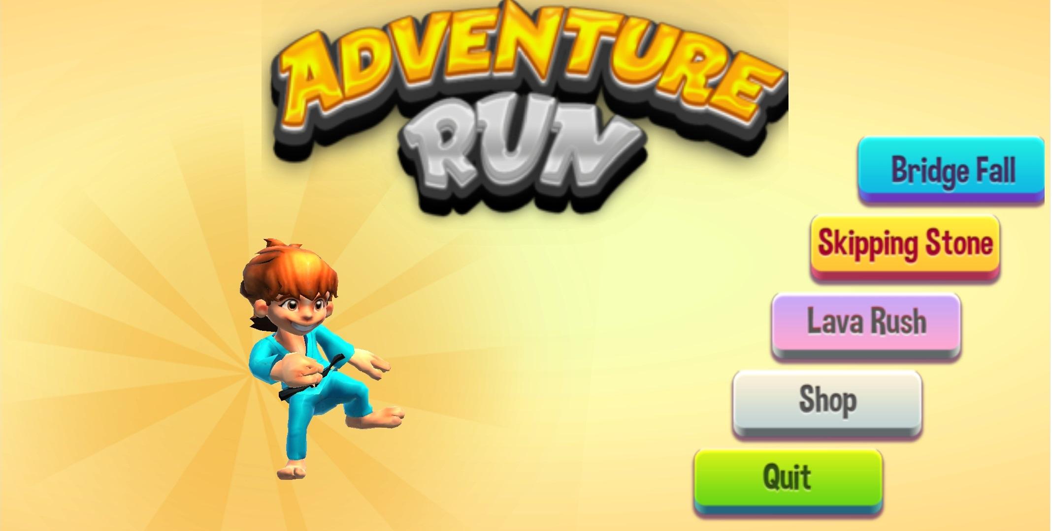 Adventure Run 是一款 3 d 游戏,有 3 种不同的模式。在跳过石头模式下,你需要用石头过河。小心,会有假石头把你扔进河里。在熔岩奔流和坠落桥中, 你需要展示你的技能和条件反射来躲避假桥。