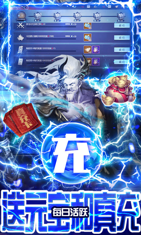 上线送V5、100万铜币、58888元宝、10万粮草,万充活动等级达到送累计万元以上真实充值卡,每次主公升级都可领取大量元宝,七日登录送大量元宝、累计签到送大量元宝,每日活跃任务送大量元宝和10元真实充值卡