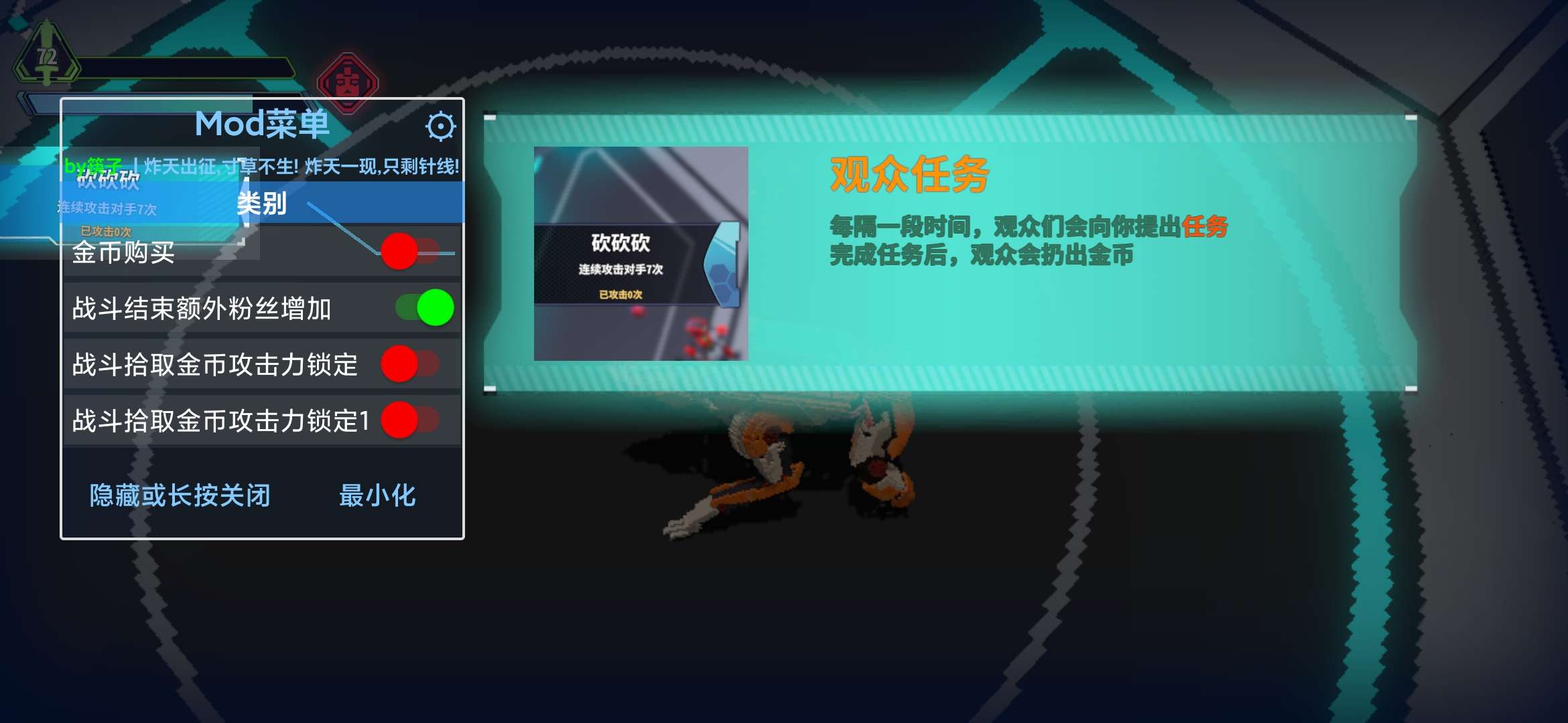 MOD菜单:金币购买战斗结束额外粉丝增加(负提升,懒得改)战斗拾取金币攻击力锁定