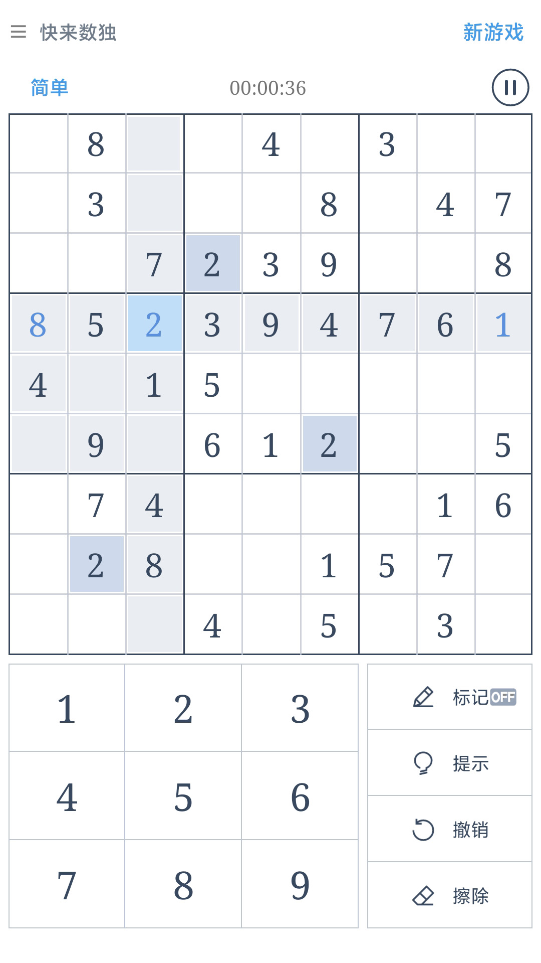 数独是源自18世纪瑞士的一种数学游戏。是一种运用纸、笔进行演算的逻辑游戏。玩家需要根据9×9盘面上的已知数字,推理出所有剩余空格的数字,并满足每一行、每一列、每一个粗线宫(3*3)内的数字均含1-9,不重复。