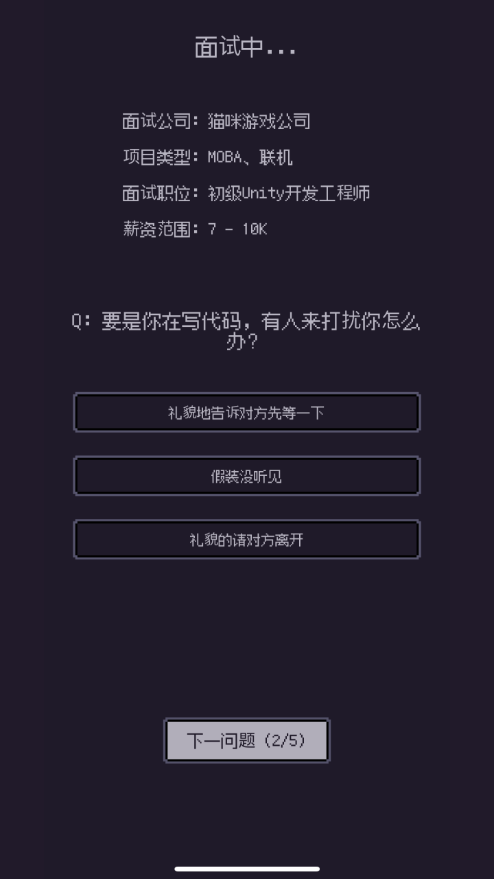 游戏开始需要完善简历信息,然后选择中意的公司进行投递和面试,拿到Offer后,不同的公司,给出的薪资略有差距,需要仔细考虑。