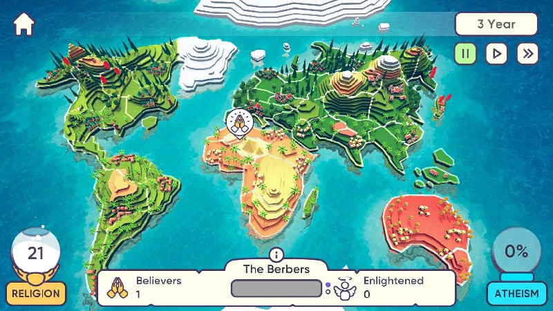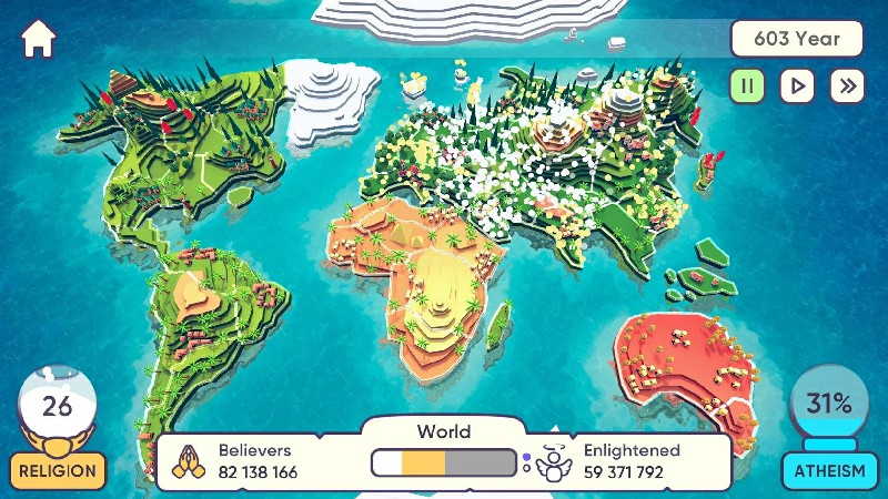 人类一直需要相信比实际更大的东西。它寻找可以引导它穿越千禧年黑暗的光。信仰一直是数以百万计的人们的光芒。宗教帮助人们克服了生活中的困难;它有助于找到和平与幸福。世界上有许多宗教。他们中的每一个人都对人们一生中提出的问题给出不同的答案。但是,您是否曾经想过不同的信仰和信念会形成什么样的形状?您可以在我们的新游戏中找到答案。创建自己的独特宗教。看看它如何经受住时间的考验。使它成为唯一团结所有人的宗教!