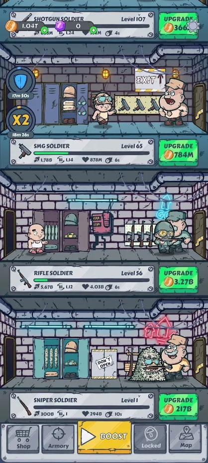 带领你的高技能部队取得胜利,穿越世界不同地区,征服地图的每个区域,继续前进。当您击败敌人时,您可以收集金币来升级您的部队和武器。离线闲置时继续收集金币。解锁武器箱以接收武器卡,以使用自定义皮肤和额外伤害升级您的武器,以帮助您的部队击败他们面临的更强大的敌人。