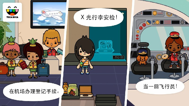 Toca Life: Vacation 中有四处探索场所,你的故事创作灵感永远不会枯竭。想从机场开始冒险之旅吗?体验 X 光行李安检机、登机和参观驾驶舱的乐趣。然后品尝点心、享受飞行乐趣!在目的地,有许多活动供你选择:购物、在木板桥上观光、海滩游戏、大海冲浪以及游览酒店。