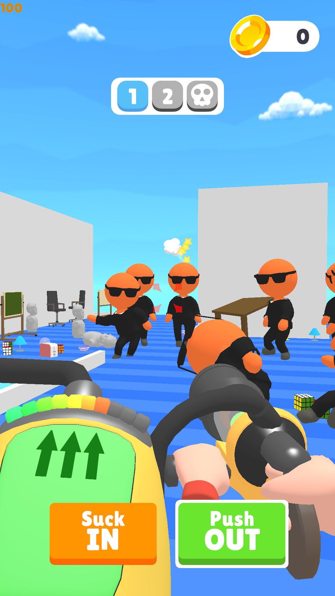 在这个游戏中,您可以通过在屏幕上移动手指来使用真空枪来控制您的角色。通过将视线指向对象和敌人,您可以画出分体,然后作为投射物射击。您可以通过按下屏幕底部的按钮在射击和缩回模式之间切换。在关卡中消灭所有对手以获胜!不要让他们逃跑!