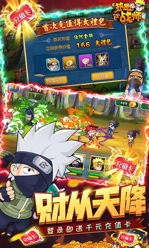 1.上线送满V,及千元充值卡,海量资源1元礼包无限购;2.充值比例1:1000,首充双倍钻石返利,首充即送超强六道佩恩以及海量道具;3.超值月卡随心组合,超多钻石随便花,福利相伴不孤单!4.开服7日登陆狂欢,海量英雄、极品装备、稀有道具,全部免费领取。
