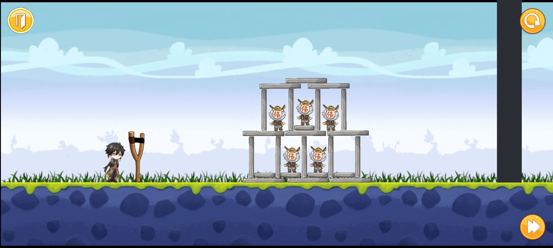 愤怒的可莉AngryKeli是一款有趣的以原神为主题的射击游戏。玩法却是类似愤怒的小鸟,将可莉使用弹弓发射出去击败丘丘人