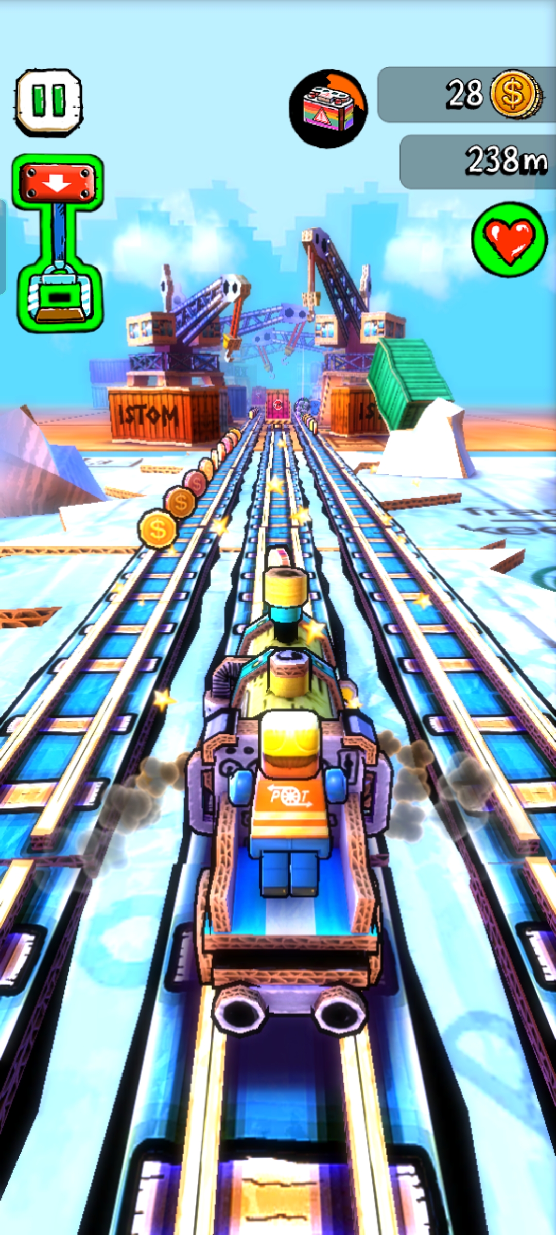 测试您的跑步技巧,同时参观各种类似于儿童玩具室的铁路。充满色彩、动作和随机性,每次运行都提供新的东西。在多条铁路之间进行选择,穿越拥挤的火车站、广阔的沙漠、狭窄的洞穴,并解锁有趣的人物或火车,这些人物或火车会出现在活泼的玩具世界中。