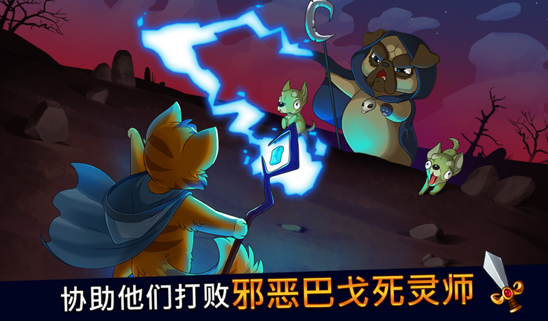 "「PlayStore上独一无二的放置猫咪收集角色扮演游戏。收集英雄猫咪们并和邪恶的巴戈死灵师战斗!!」