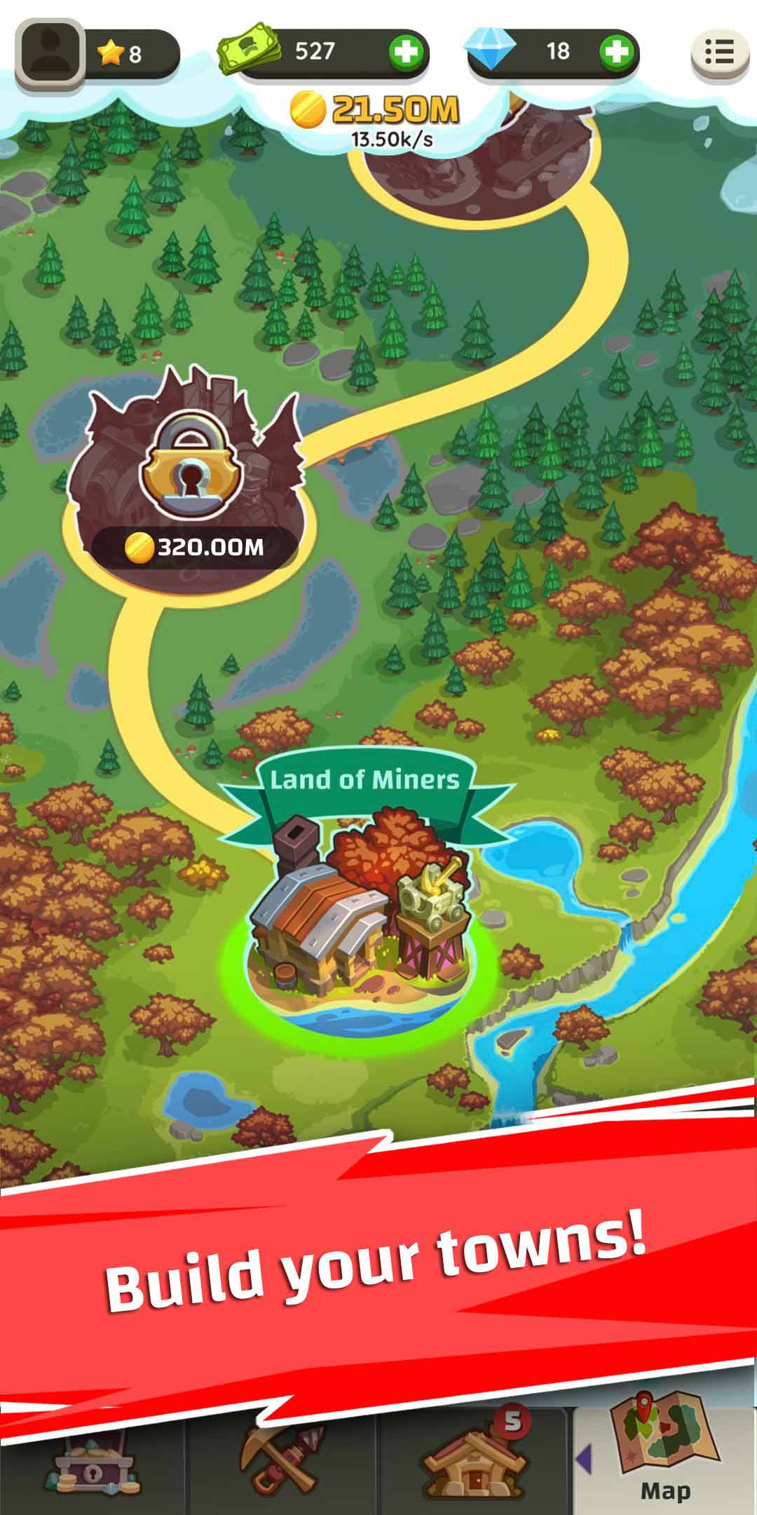 升级您的矿工,扩展城镇,进入新的未被发现的土地,开发闲置业务 !