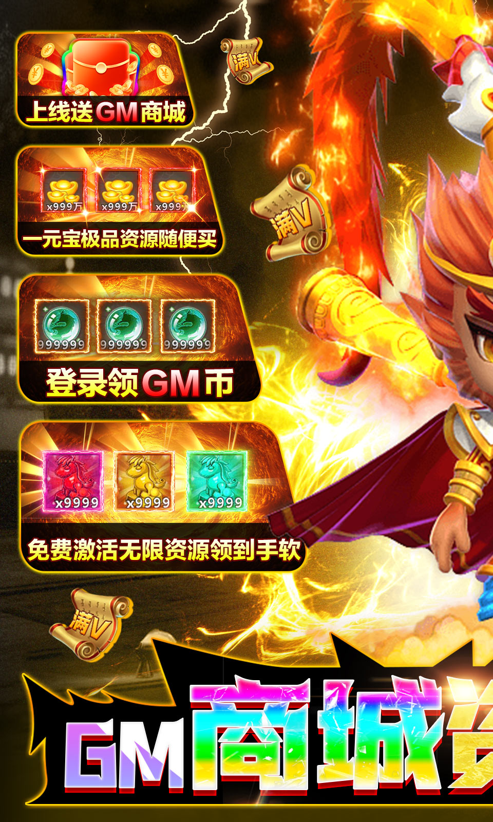 1、上线送福利:创角送满VIP15,一万元真充卡,888万金币,888888元宝,5000体力,极品英雄孙悟空。2、GM特权:累充激活GM特权,每日可领取海量材料,助你快人一步!3、无限资源:每日登录领取GM币,可激活无线资源,无限次数领取!4、GM商城:每日在线免费领取GM商城经验激活GM商城,一元宝无限购买极品资源!
