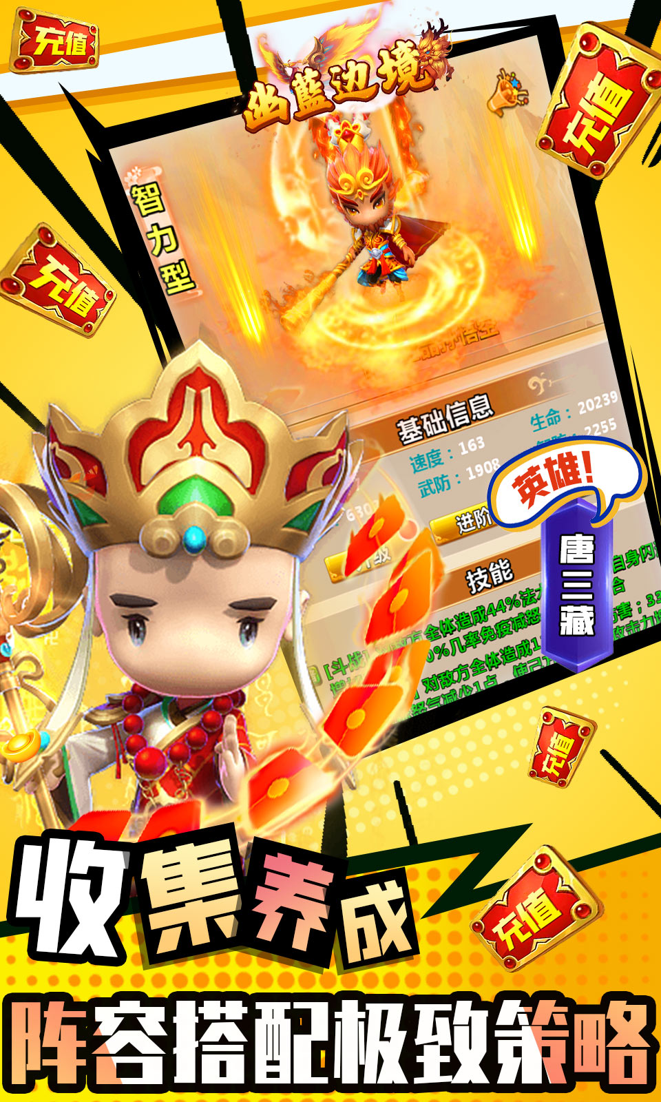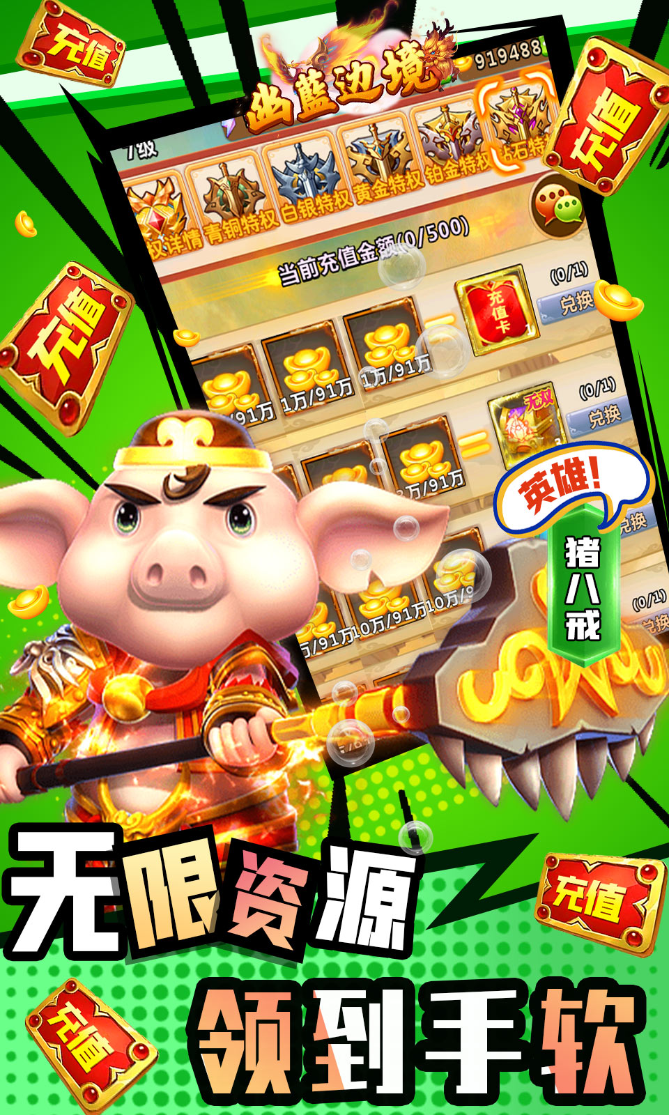 首日创角送满VIP15,一万元真充卡,888万金币,888888元宝,5000体力,极品英雄孙悟空。融合放置类游戏还原经典的同时还包含了丰富的游戏内容:放置、战斗、收集、养成、任务、竞技场等,阵容随意搭,画风精致优美。