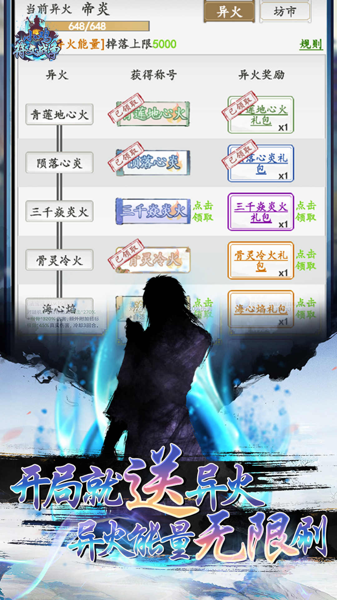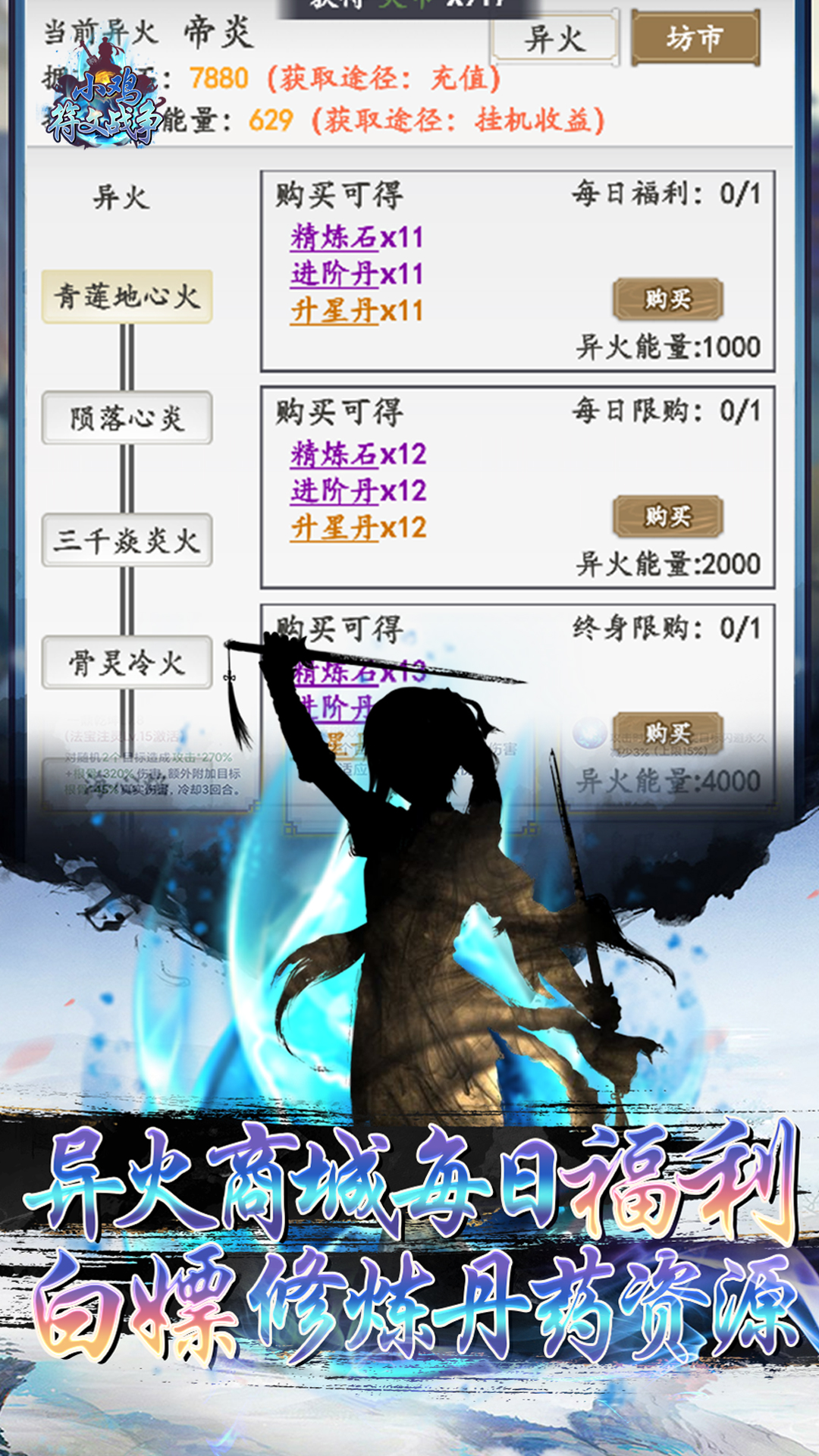 1、开局送异火,神品功法,金手指额外战力2、每天刷异火能量,无限兑真充3、只需每天在线,可直飞大乘期