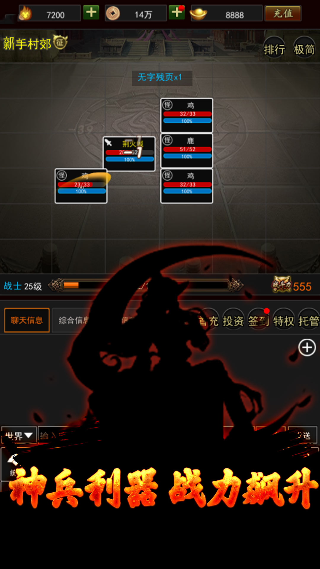天地劫是一款非常新颖的文字休闲挂机类手游,在这里可以轻松的挂机升级和打宝,彻底释放你的双手。百分百的装备回收以及铁匠锻造助你打造最强神兵利器,不花钱也能当大哥。丰富的策略配装,低战力也能挑战大BOSS。此外还有大家熟悉的游戏内容通过文字的包装,带给你不一样的体验,在文字世界中,你就是下一位王者!
