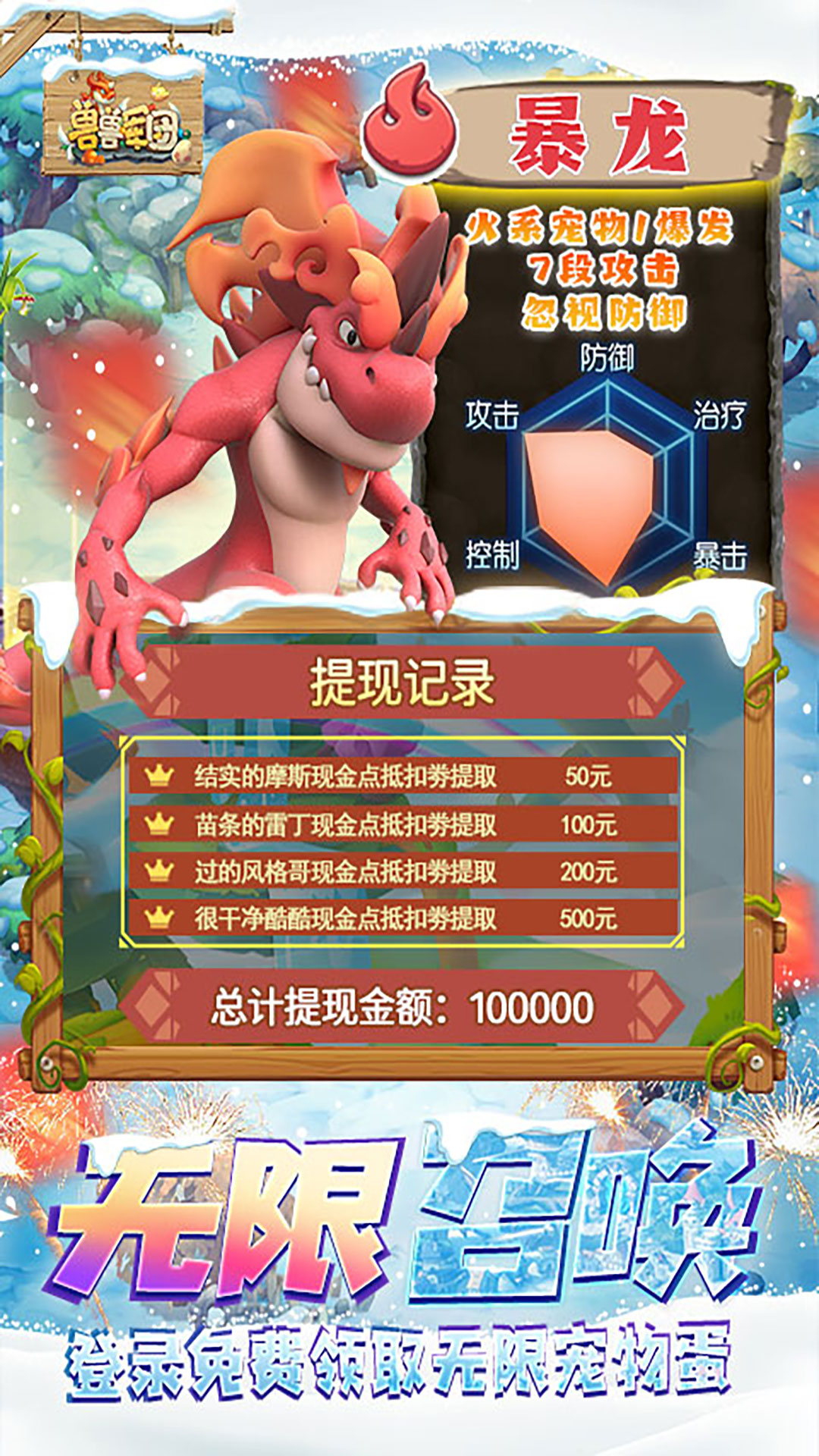 《兽兽军团(GM现金修改器)》开局激活GM现金修改器,在线活跃获取现金点券首充月卡全免费,每日送免费直充,更送神级·月神兔,无限抽奖,无限资源,GM礼包等等!《兽兽军团(GM现金修改器)》是一款萌宠养成收集休闲挂机手游,独创人宠一体骑乘作战,上百种史前萌宠和技能随心搭配,给你最畅爽刺激的战斗体验!更有丰富的部落战、boss战等大型战斗副本,和你的萌宠一起开启原始冒险吧