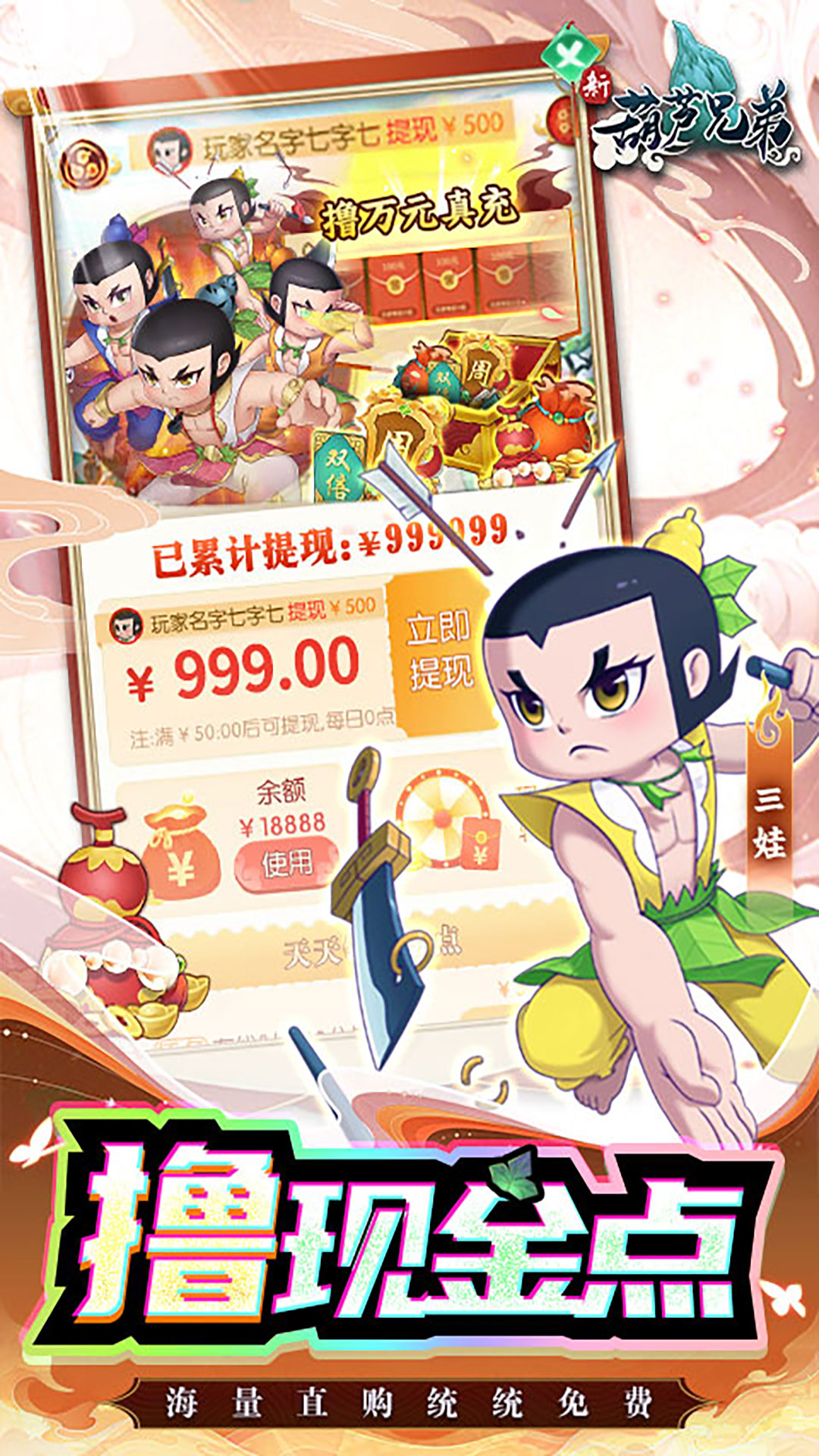 1、万元真充大礼(可激活累充VIP)2、开局送满V10(无两套VIP,仅此一套)3、登录送T0伙伴(魔·七娃)4、每日送现金点(可购买每日每周每月等直购礼包以及月卡基金)5、GM破解器(每日可免费解锁资源货币)6、充值比例1:10000元宝,免费领取首充(领T1伙伴铁拳小金刚)7、现金点免费抽取(现金点可购买游戏内直购商品)8、唯一货币(无特殊货币)9、上线免费200连抽
