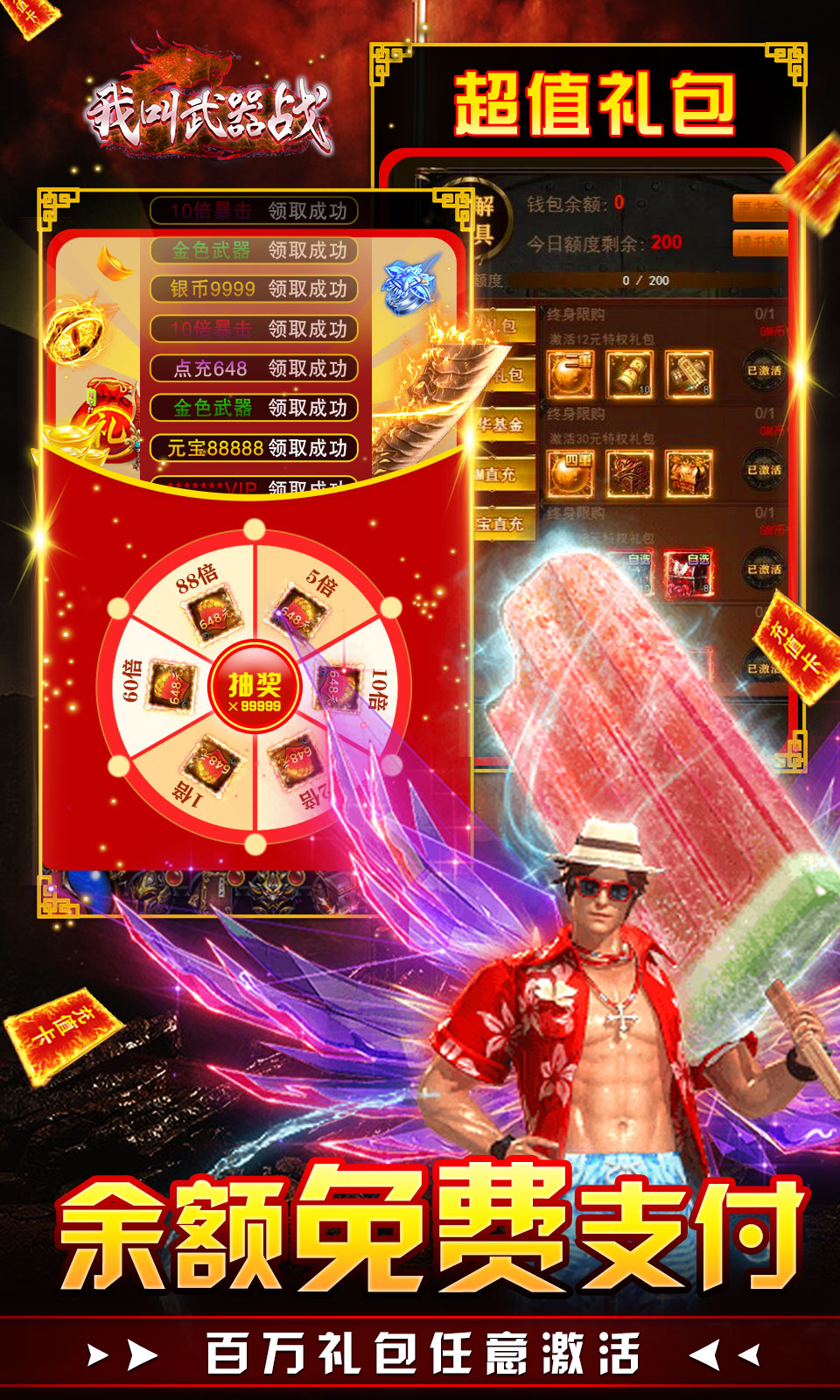我叫武器战(无限提充648))是一款全新单职业挂机H5传奇动作手游!每天上线就能免费点充648!首冲!累充!vip!统统免费激活!能拿多少全看手速!各种玩法掉落充值币,现金券,每天都能获得几十万充值!热血的及时竞技为了带来超凡的体验!开局绝不含糊,上线登录送888万元宝,1亿金币、绝版称号!快邀请您的兄弟一起来热血传奇pk吧!