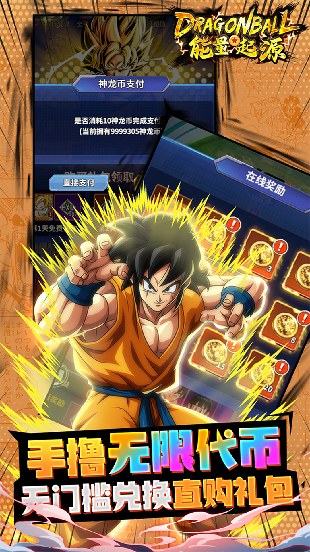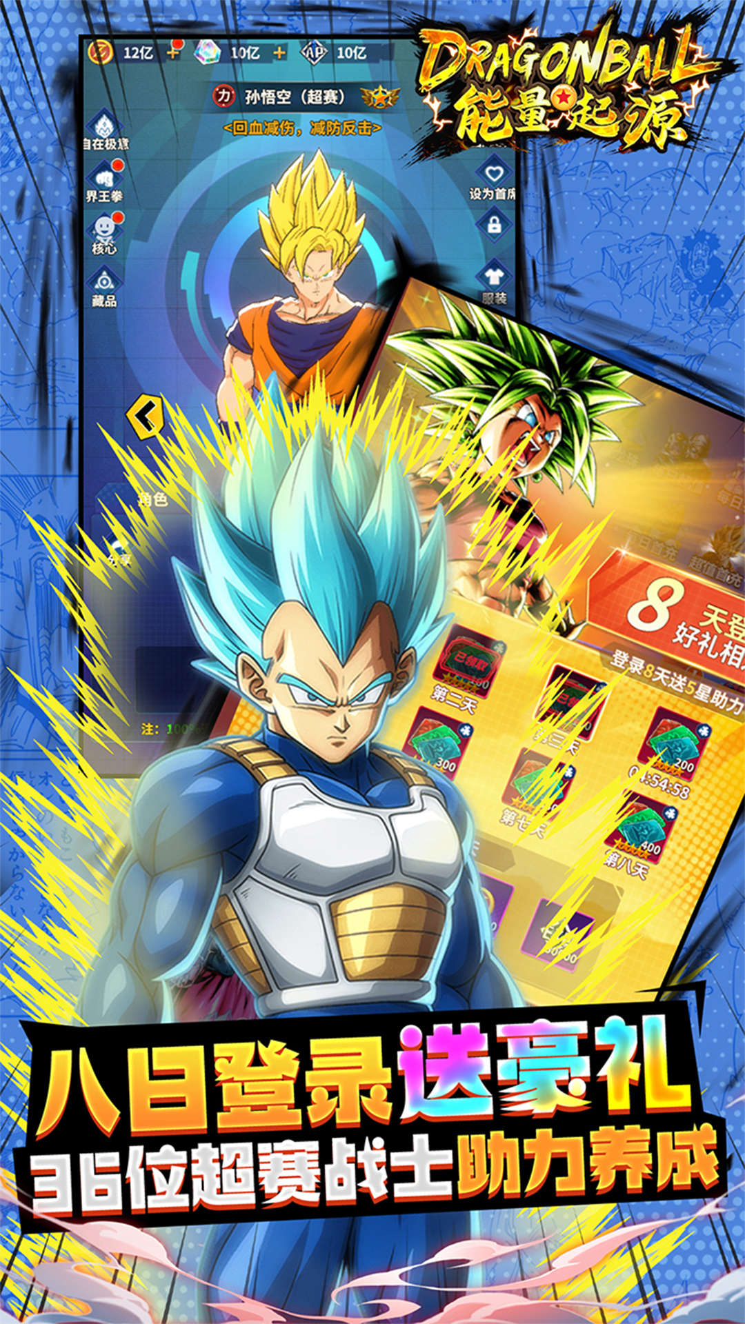 【上线福利】V8特权、高级招募券*100,超觉5星战士宝箱*1,橙色四星套装箱*1(创角后弹窗领取)【无限代币】钻石1:1000,每日任务、签到、在线奖励,领取稀有神龙币 【神龙代币】神龙币可以兑换游戏内的充值礼包(除了每日超值,其他所有礼包都可以兑换)【每日648充值】签到每日领取648充值卡,充值卡可获得648000钻石、VIP经验以及累充额度 【八日登录】累计赠送36位5星赛亚战士,登录即可享受英雄无压力养成
