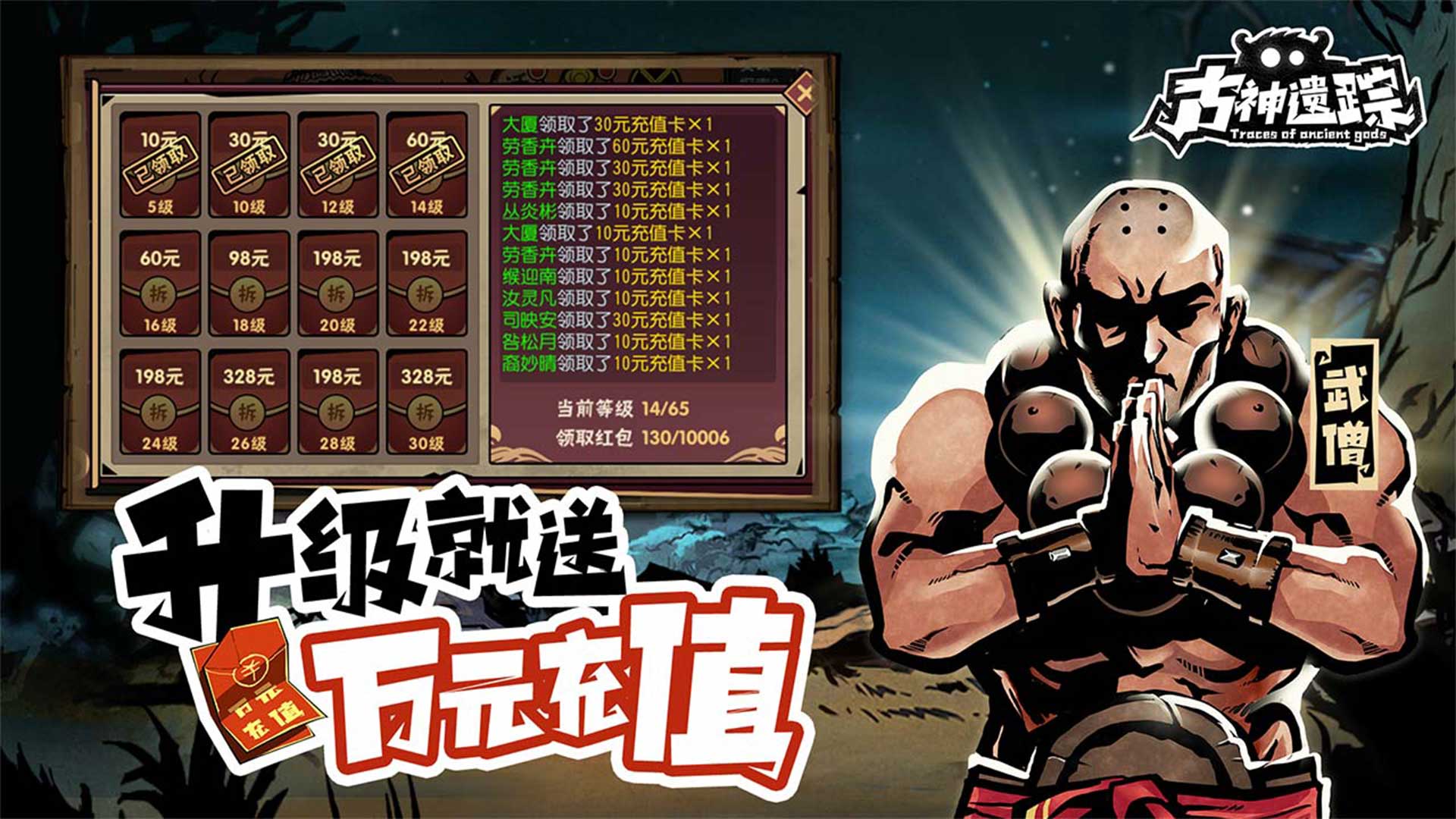 1、上线送38888元宝,88888铜币,橙色英雄白织绪,千元充值卡2、充值比例1:1000,每日在线签到送豪礼,资源道具领不停。3、天天送百抽,无限抽充值卡、充值卡碎片。4、闯关就送充值碎片,元宝不用愁,0氪金抽到爽。
