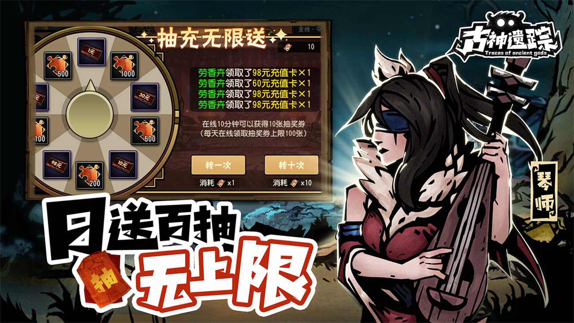 后缀说明:每天在线即可获得抽奖卷,可在抽充无限送抽取免费豪礼:送红包充值活动升级免费拿万元充值