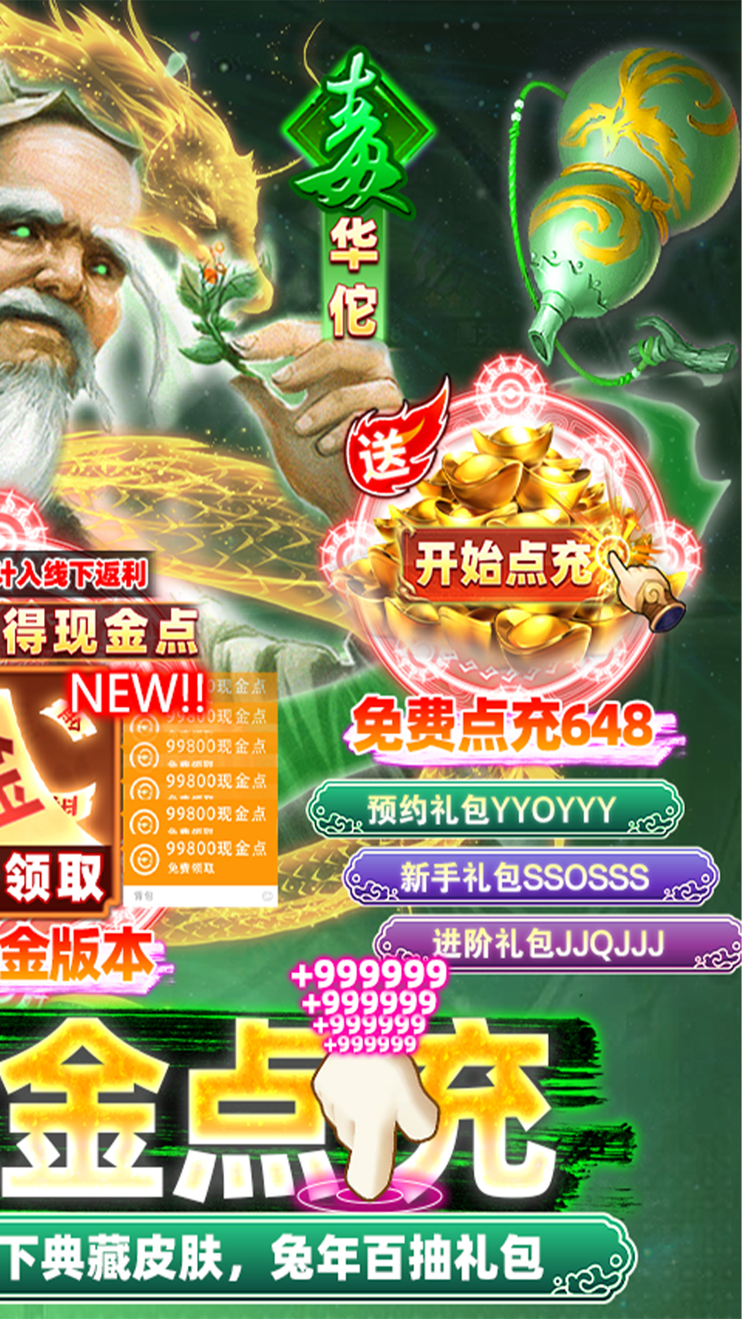 1、天胡游戏开局-满级VIP特权和免费礼包,888万8888元宝、1亿铜钱、兔年专属头像框!还有线下典藏皮肤礼包码、兔年百抽礼包码、各类资源礼包码等各种好礼邀你兑换!还有原本【华佗转盘】、【免费特权卡】等你继续体验!2、十万真实充值-连续登录在线可获得十万真充好礼,可激活游戏内大部分单笔充值、累计充值活动,免费畅玩爽翻天!3、全新现金版本-每日活跃度达到10点,就能开启每日现金点活动,初始免费获得6元现金点,完成每日任务更可获得5倍额度的现金点。购买游戏内的充值档位及直购礼包优先使用现金点,现金点消耗可计