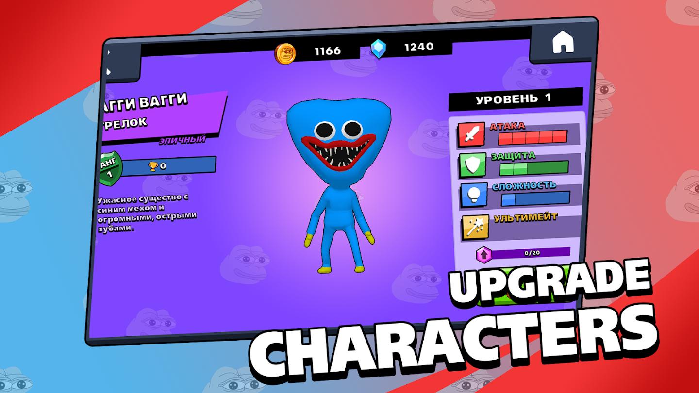 游戏中的英雄由来自模因和我们世界的各种角色代表。例如,有 Pepe Frog、Huggy Wuggy、Big Floppa Cat、Snus-eater (Anonymous)、Glad Valakas 等。所有英雄都有独特的攻击、超能力和外观。此外,在游戏中,还有一个角色等级和一个评级系统,其中包含一组赢得比赛的奖杯。