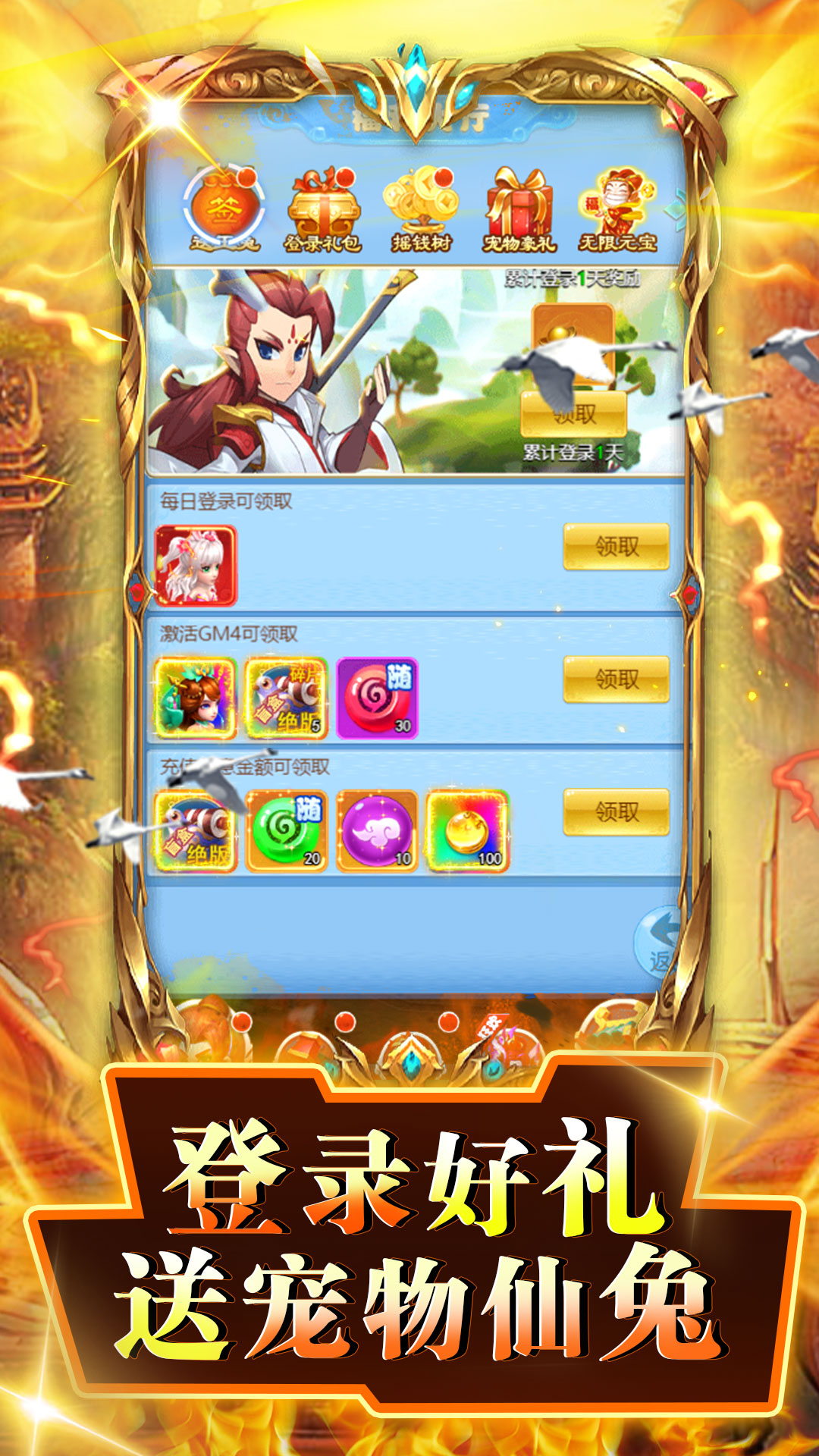 1、创角海量仙玉、元宝赠送!2、开服登陆送豪礼,每日送超值宠物仙兔!3、开服排名活动赢海量强力道具、称号!4、充值比例:1:20000(仙玉),挂机自动战斗,解放双手成就梦想!5、过任务,拿奖励,完成任务即可获得丰厚奖励!