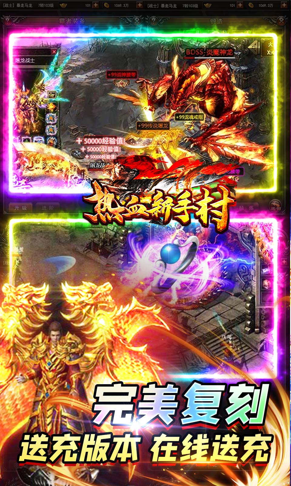 1、上线送500真充卡+精美材料2、在线、打怪均有充值,白嫖也能当大哥3、爆率超高,光柱满屏4、复刻经典端游玩法,上百地图等你来玩