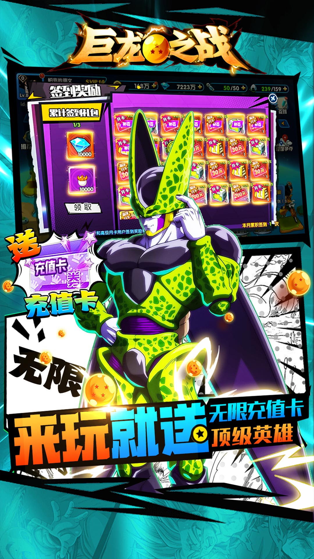 超爽横版龙珠卡牌手游-《巨龙之战(狂飙商城50W抽)》震撼来袭!本次版本的福利力度与升级速率大幅上调,怀旧经典IP改编而成,华丽的视觉战斗设计,完美展现最真实的打斗,体验最震撼的打击快感,与超级赛亚人组队,一起闯出一番天地吧!