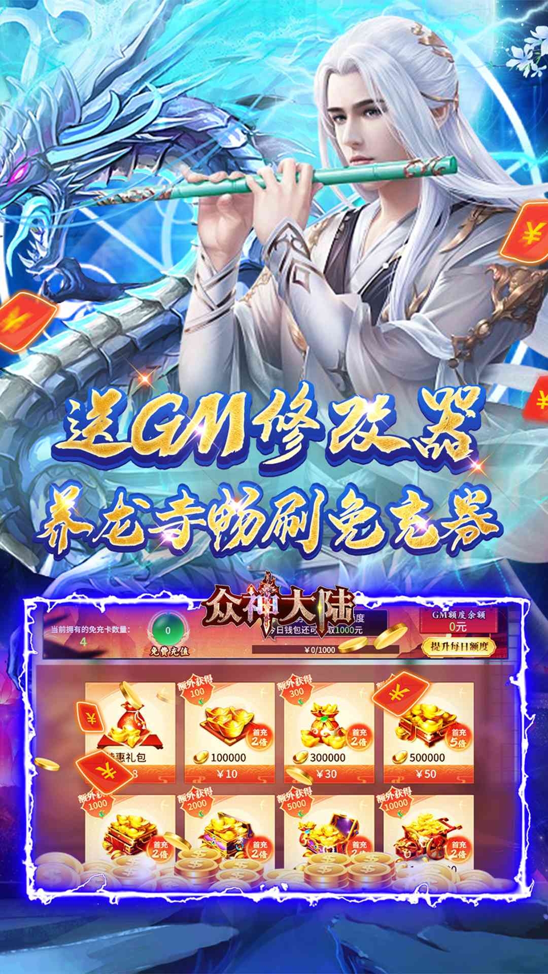 1、GM修改器1级开放免费使用,首充。刷真充,特权,无限资源全免费。全白送。 2、全新地藏角色,完成任务免费送大威天龙!3、元宇宙商城免费开放,内有多种稀有道具,翅膀。4、创角即领1000元真充*1,在线即送万元真充卡、银两*5000万,圣权激活卡,满级会员,黄金VIP称号卡*15、送超级会员3,每个等级都能领取会员礼包、道具丰富、每日奖励还有元宝和银两领取。6、每日签到领取200充值卡,累计签到可领取月卡、元宝、银两7、特价无限资源,无限货币瞬间起飞8、天天在线豪送1000元真充卡,不花钱也能