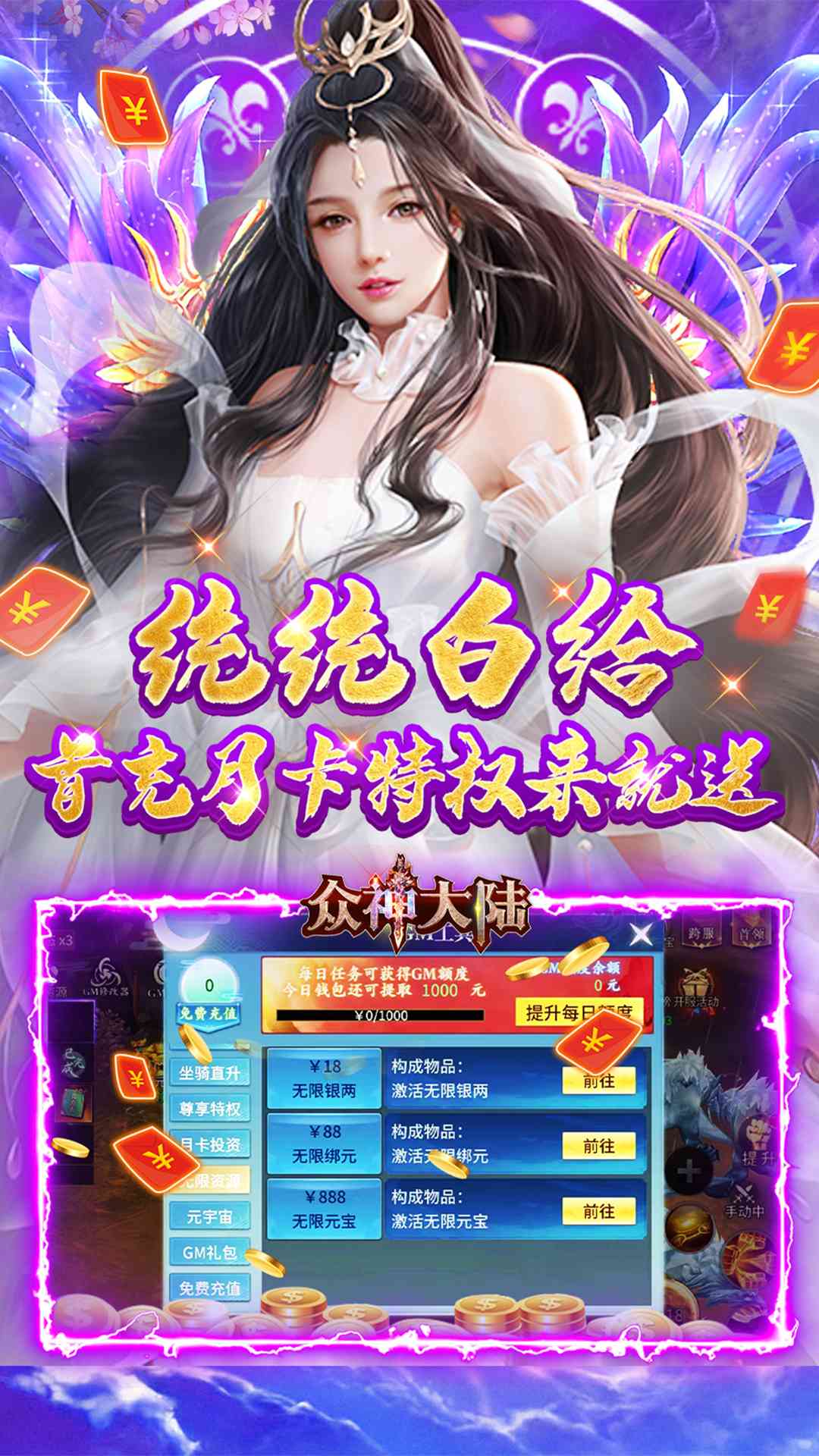 《众神大陆(元宇宙地藏养龙)》是一款以激爽战斗为核心的3D炫战ARPG手游。福利大幅提升,上线就送GM修改器,1000元真充*1,银两*5000万,圣权激活卡,满级会员,黄金VIP称号卡*1,天天再送千元充值卡!让你玩到爱不释手!