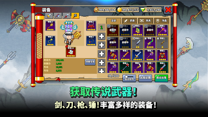 可使用各种时装装扮你的废柴。学习向往的武功,击退强敌!#丰富的玩法,无限刷刷刷!多达8种放置型玩法系统。快速培养废柴挑战极限!
